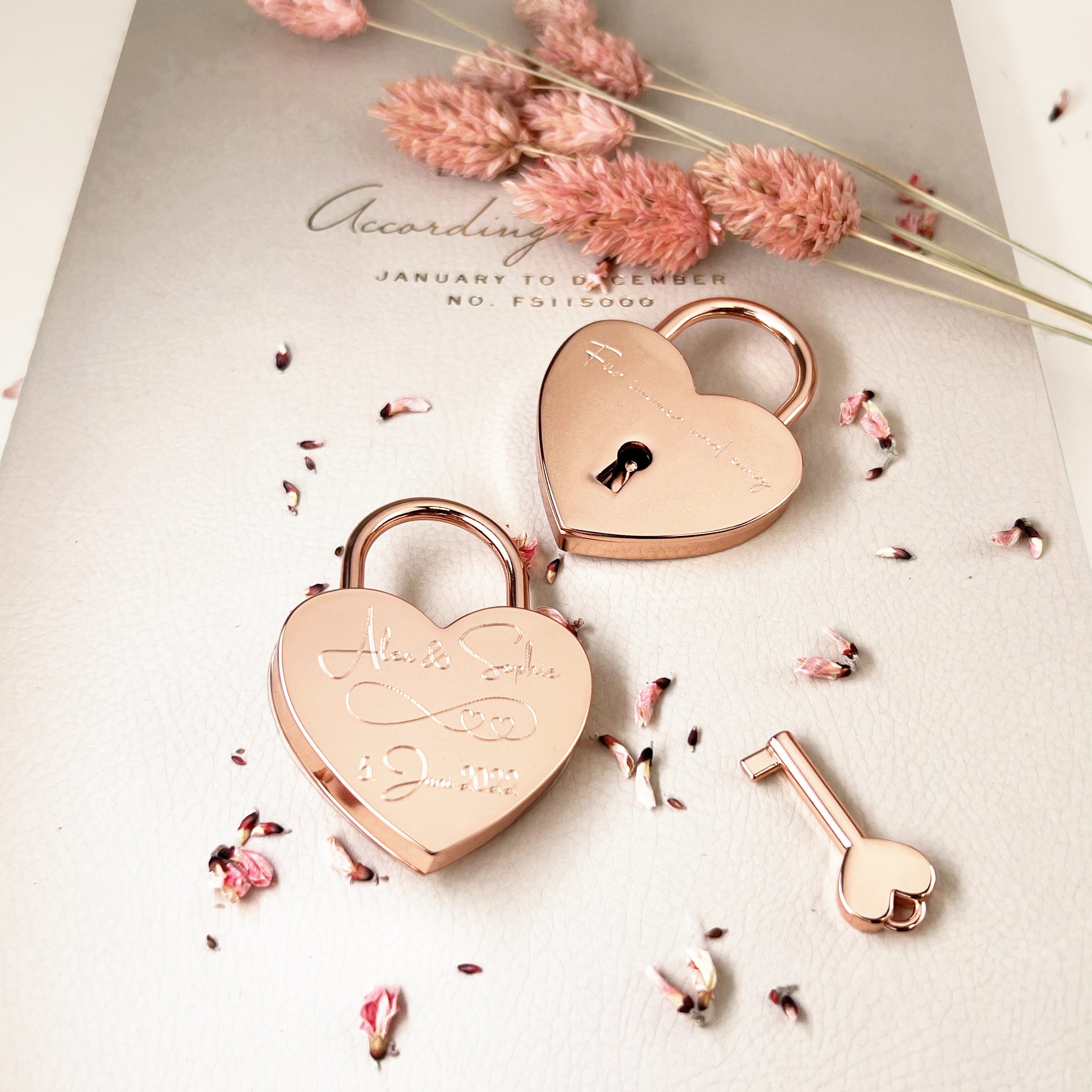 Die Roségold-Farbe steht für Intuition und Stärke. In der Farb- und Symbollehre wird sie mit dem Schutz vor negativen Energien und der Förderung von Harmonie in der Beziehung assoziiert. Mit seiner glänzenden Diamantgravur wirkt das Schloss edel und schafft eine harmonische Ausstrahlung.