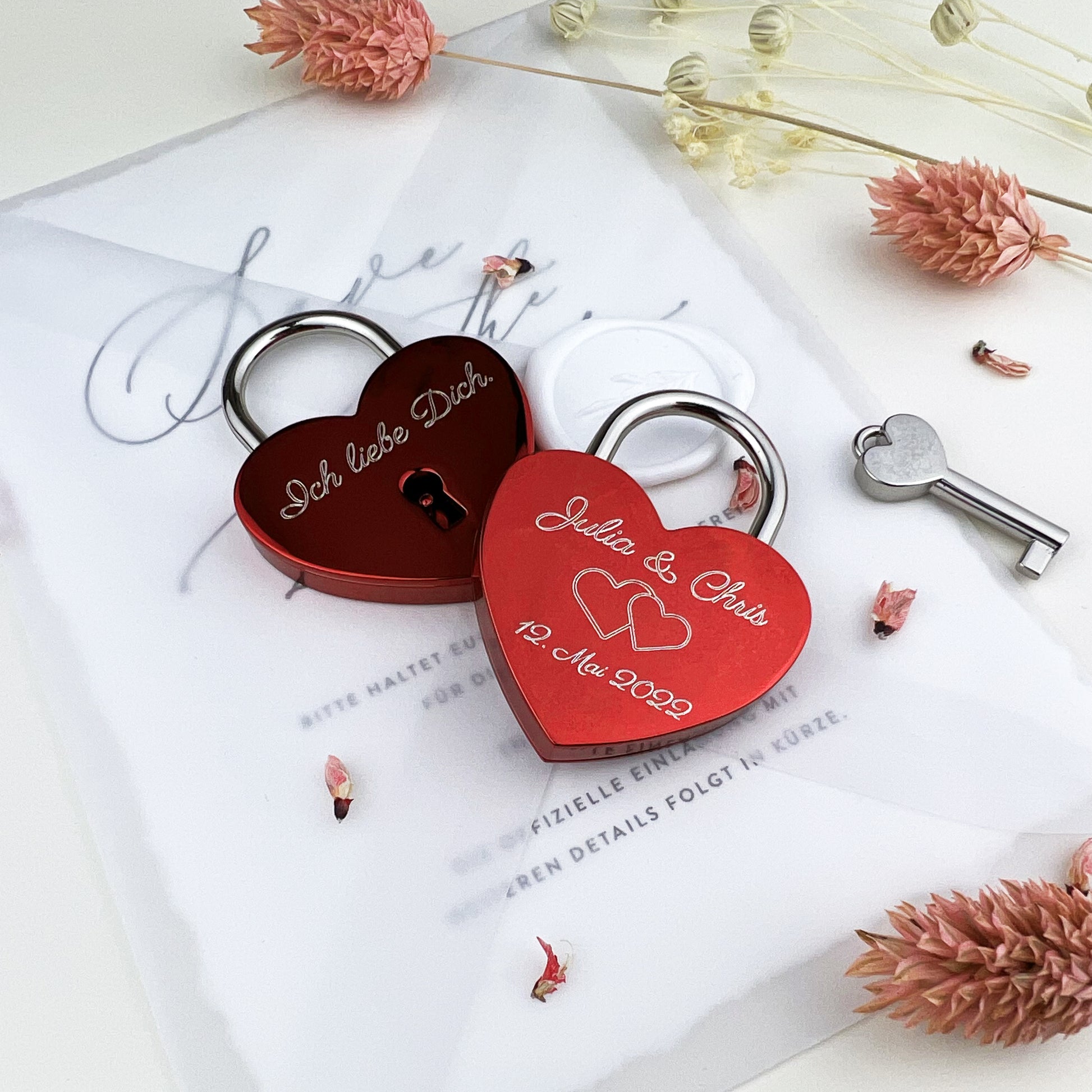Die silberglänzende Gravur bildet einen wunderschönen Kontrast zum intensiven Rot des Schlosses und verstärkt die emotionale Ausstrahlung. Rot symbolisiert nicht nur die Liebe, sondern auch Leben, Leidenschaft und Kraft – es spiegelt das temperamentvolle, sinnliche Wesen der Liebe wider.