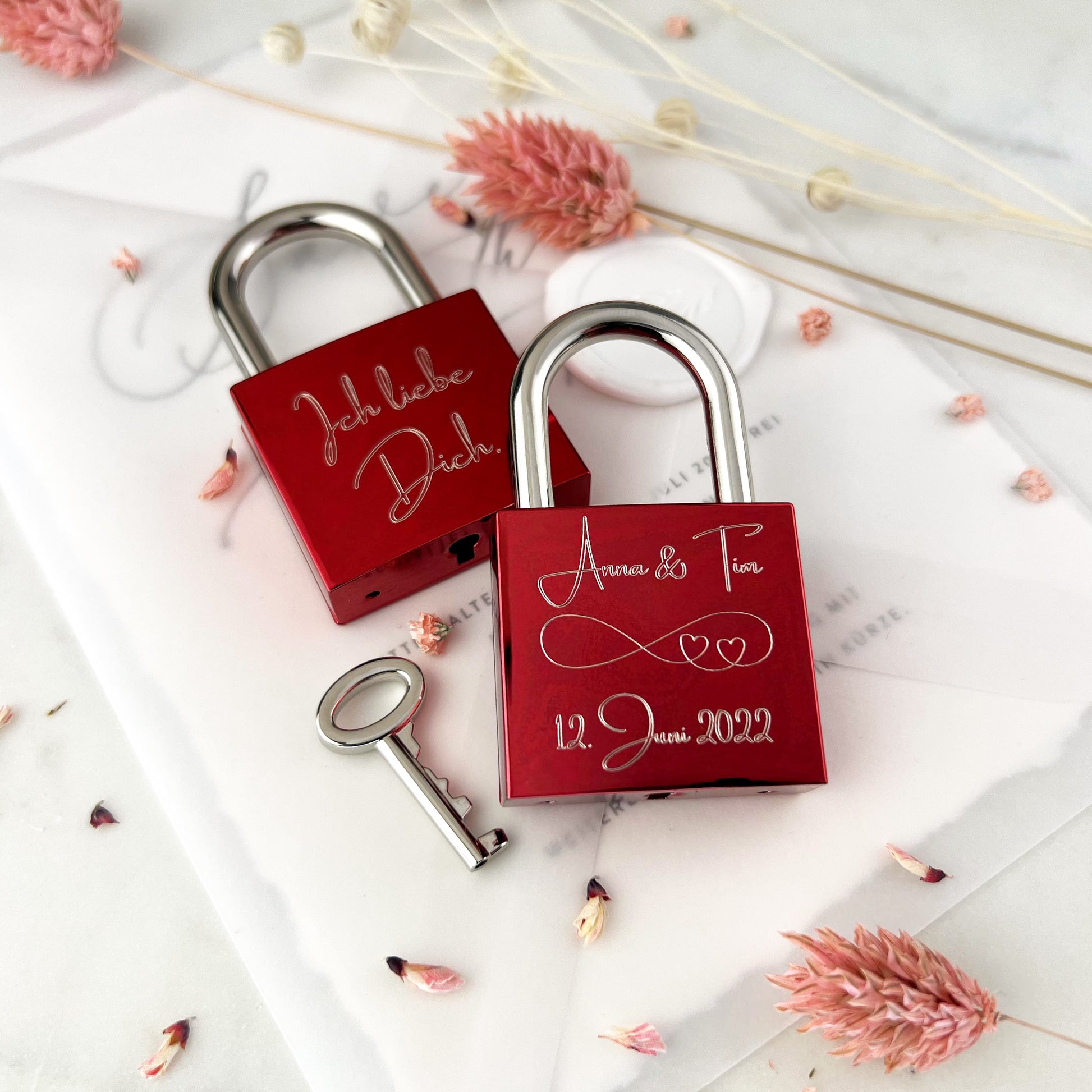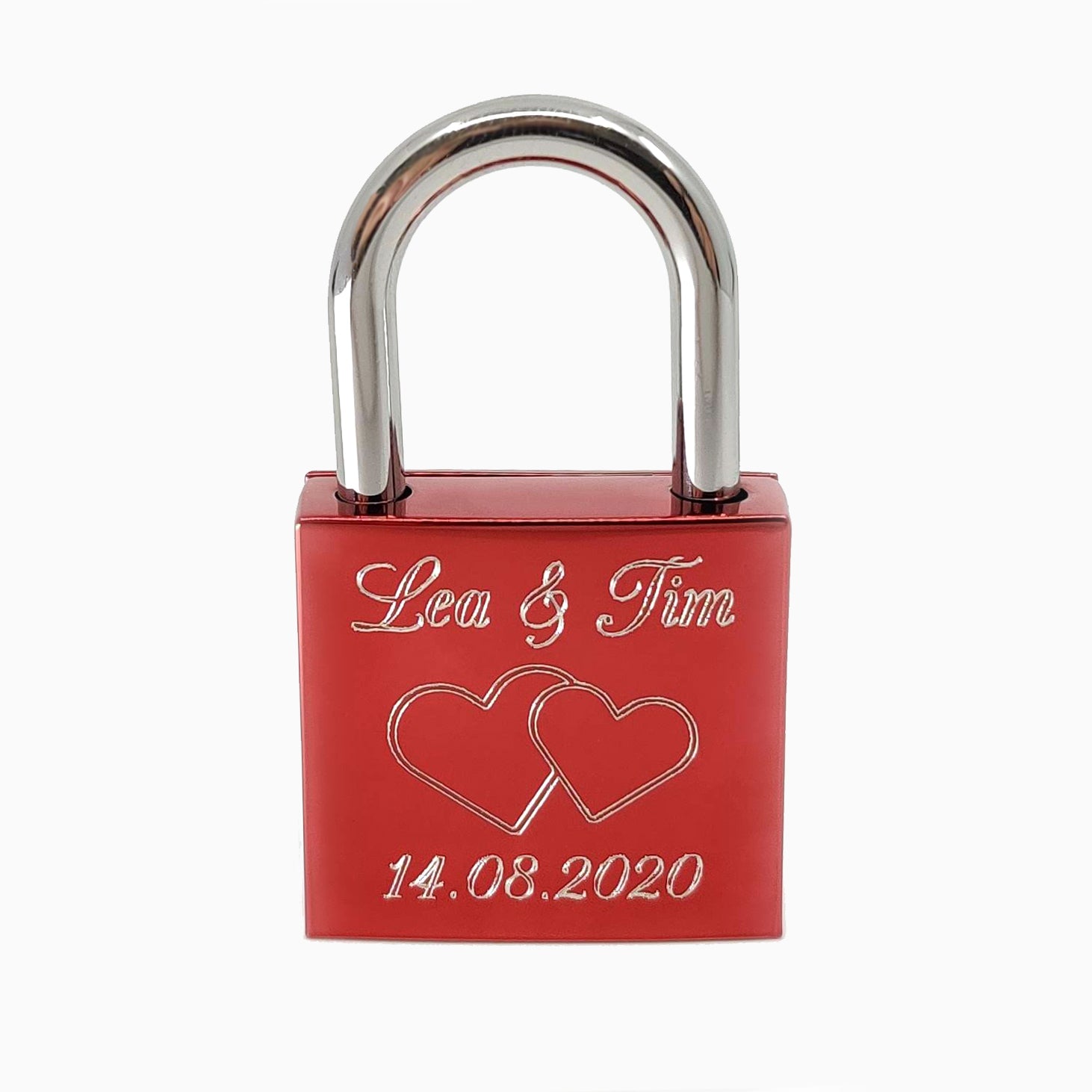 Charakterstark und edel - das Liebesschloss Rot + Herz-Schlüsselanhänger mit Gravur